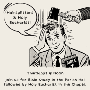 Hairsplitters and Holy Eucharist: Thursdays at noon we meet in the Parish Hall to discuss the Lectionary readings for the upcoming Sunday. Sometimes we even “split a few hairs” in our discussion which lovingly led to our Bible Study’s moniker. Around 12:30 we transition to the Chapel located in the Parish Hall for Holy Eucharist. Everyone is Welcome!