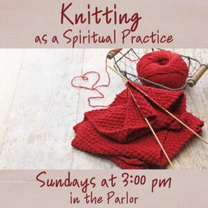 Knitting Group: Sundays at 3:00 pm in the Parlor. No experience is nessecary. Bring your yarn and knitting needles and we’ll learn together.
