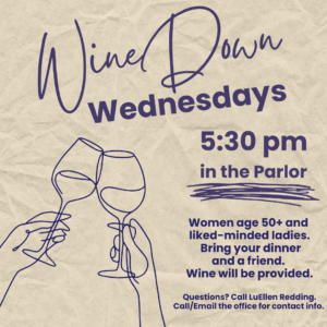 WineDown Wednesdays: Women age 50+ and like-minded ladies are invited to join us on Wednesdays at 5:30 pm in the Parlor. Bring your dinner and a friend. Wine will be provided. Questions? Contact LuEllen Redding or the parish office.